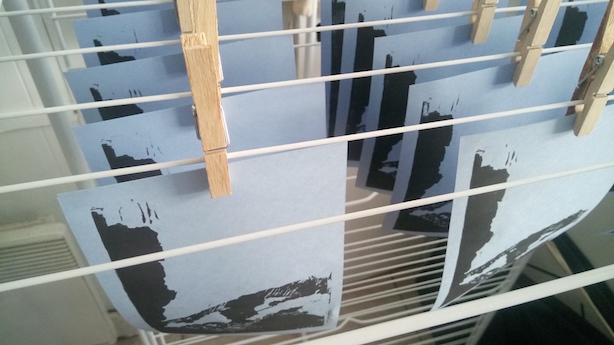 En bonus, voici quelques images de l’atelier avec un aperçu d’un test d’impression (ci-dessus) et les estampes en cours de séchage (ci-dessous).